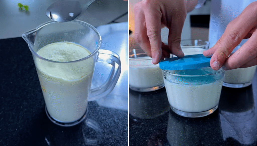Em um recipiente coloque todos os ingredientes e bata com o mixer até ficar bem espumado. Então, divida em potinhos colocando 170g em cada e leve para a geladeira.