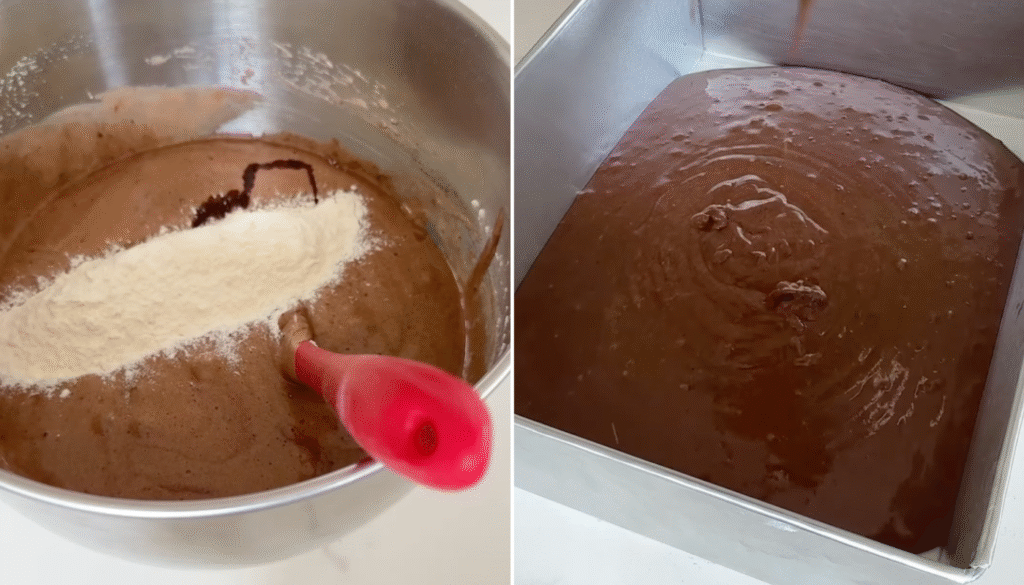 Primeiramente, para a massa, bata os ovos com açúcar até ficar um creme branco e fofo. Misture a água quente com o cacau e o óleo. Vá acrescentando essa mistura nos ovos batidos e intercalando com a farinha. No final junte o fermento com bicarbonato e passe a massa para uma forma com desmoldante e papel manteiga no fundo. Então, leve ao forno pré-aquecido em 180°C.