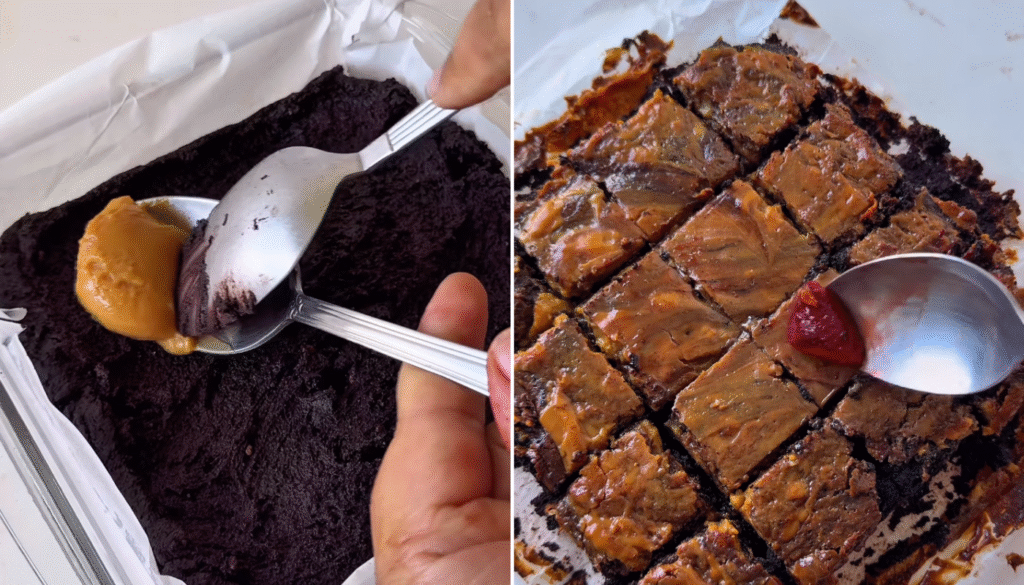 Em uma forma de 20×20 com papel manteiga, coloque a massa e vá acrescentando colheres de doce de leite. Você pode ainda misturar levemente a parte de cima da massa com o doce de leite ou deixar as colheradas como você colocou. Leve para assar em forno pré-aquecido a 180ºC por 30 minutos.