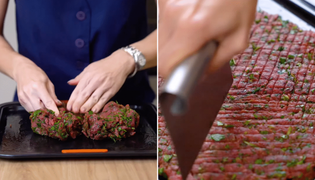 Misture a carne muito bem com os temperos e, em uma forma untada com azeite, abra ela até atingir cerca de um dedo de altura. Então, com uma espátula ou parte de trás da faca, faça marcações nas diagonais, regue com azeite e leve para assar a 200ºC por 20 minutos.
