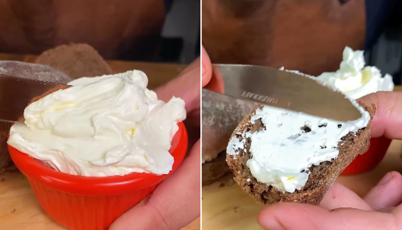 Coloque a manteiga em um recipiente e bata com um fouet do mixer ou batedeira. Então, vá adicionando a água aos poucos enquanto bate até a textura mudar.
